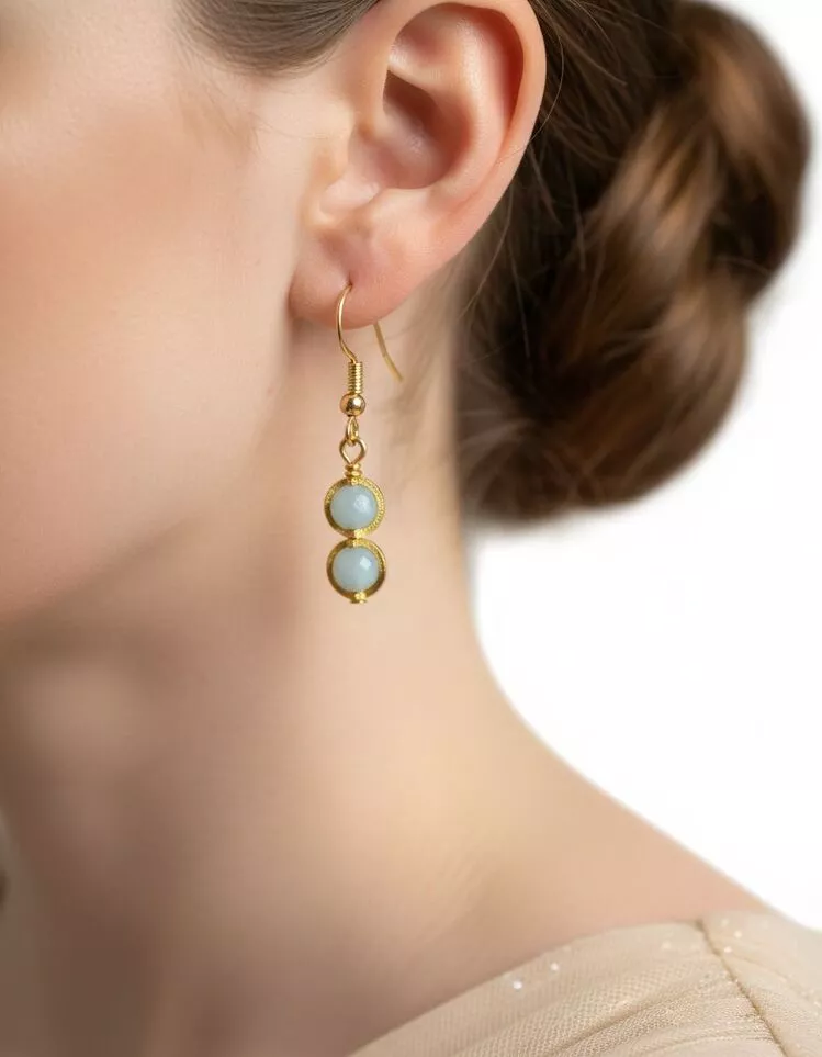 Bu özel takım; kolye, bileklik ve küpeden oluşur. Her bir parçada doğal Akuamarin taşının ferahlatıcı mavisi ve altın detayların sıcak ışıltısı buluşur.