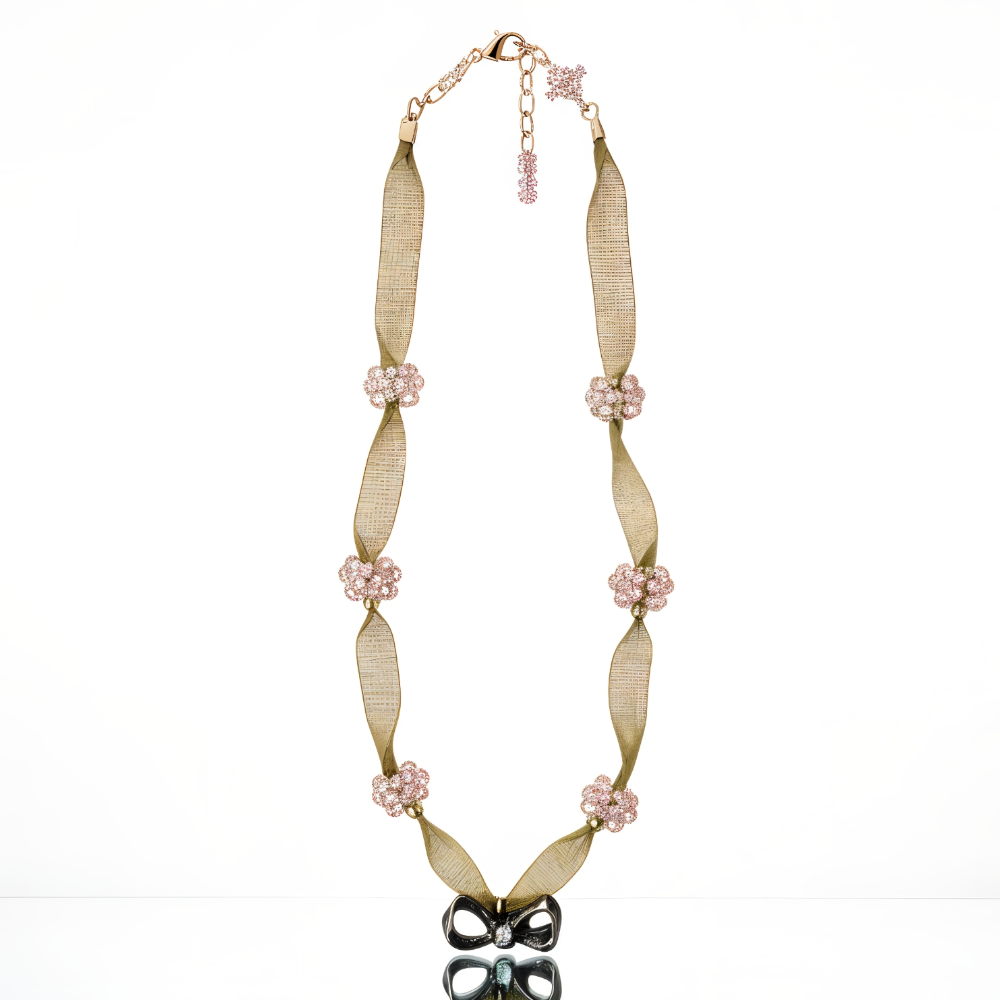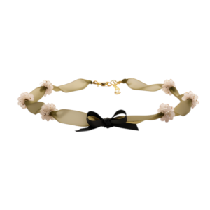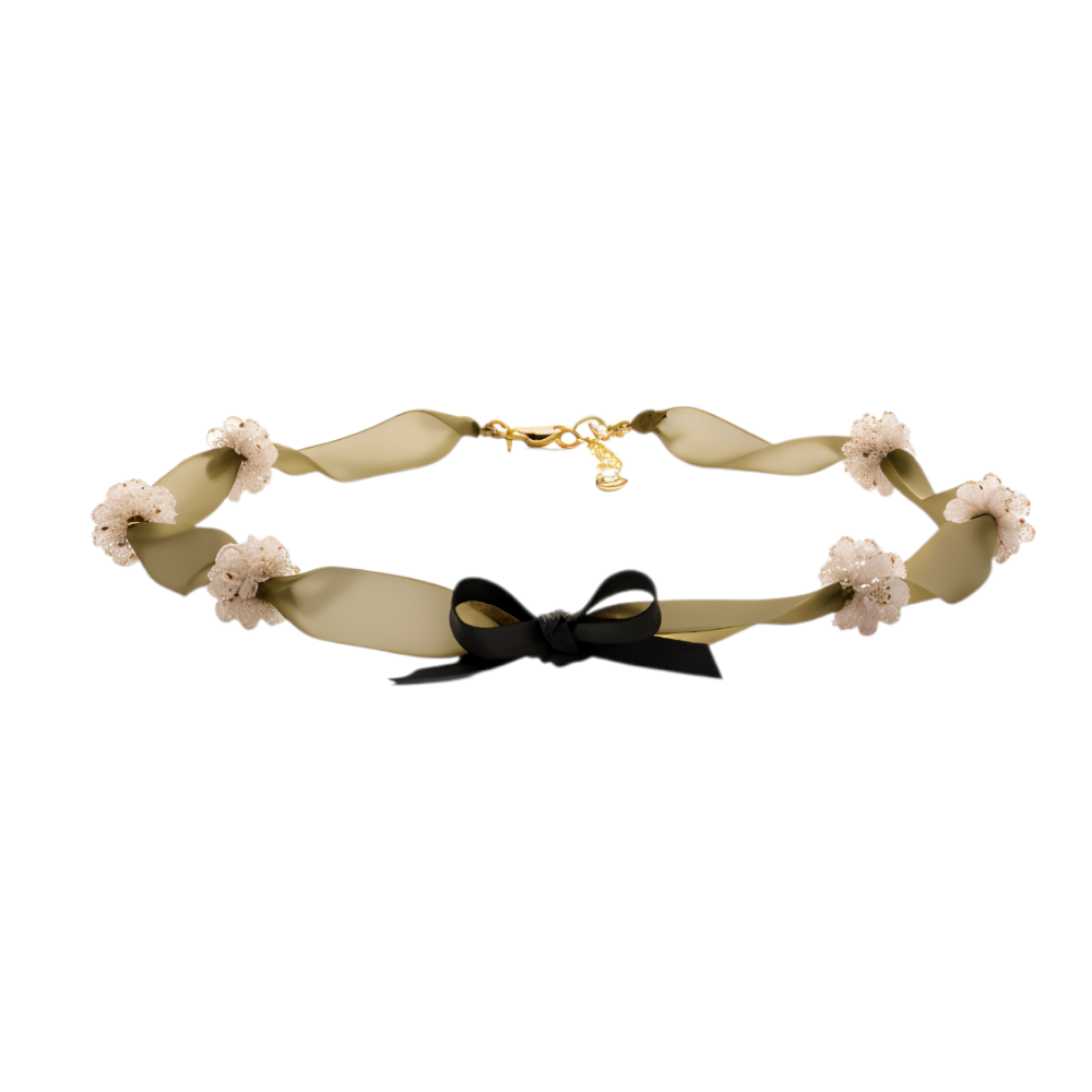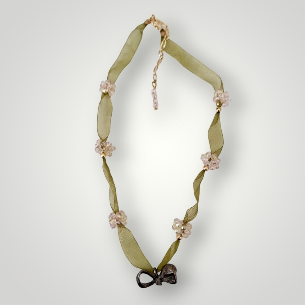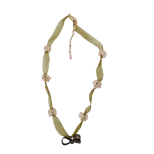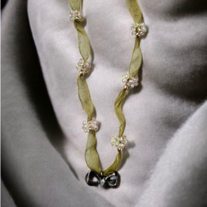 Yeşilin doğal dinginliğini boncuk çiçeklerin ışığıyla buluşturan bu el yapımı tasarım kolye, özel bir dokunuş arayanlar için özenle hazırlanmıştır. Yumuşak dokulu kurdele, tasarıma hem zarif hem de romantik bir hava katarken, aralara işlenen boncuk çiçekler ışıltılı bir görünüm sunar.